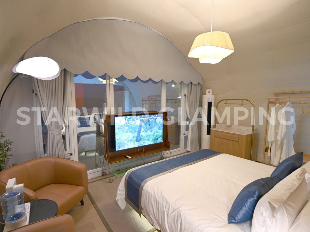 星链帐篷以独特的仿生造型,融合现代建筑美学与自然灵感。其标志性大舷窗设计和流畅曲面结构,搭配全景落地断桥铝中空玻璃幕,如同贝壳向自然舒展,将户外山水晨昏无界纳入室内视野。