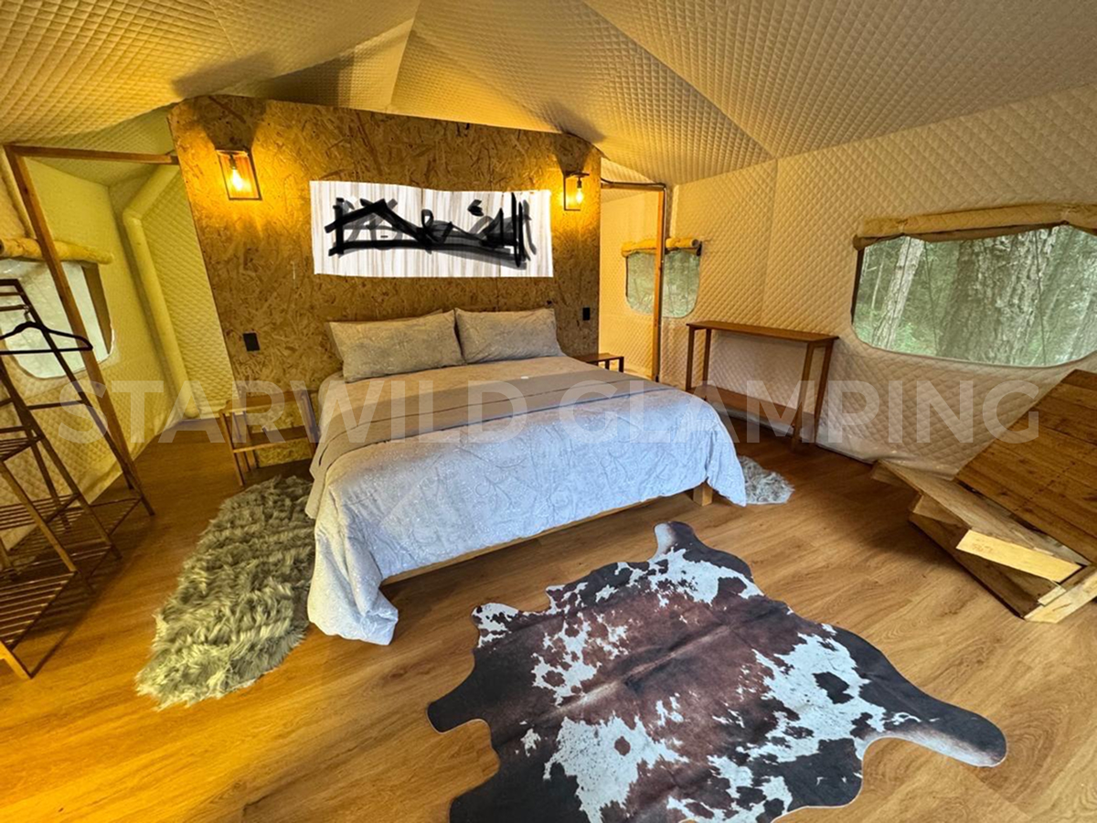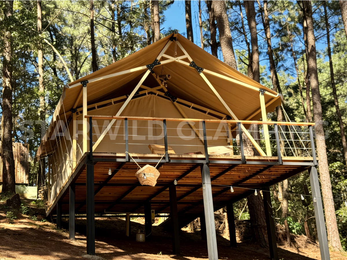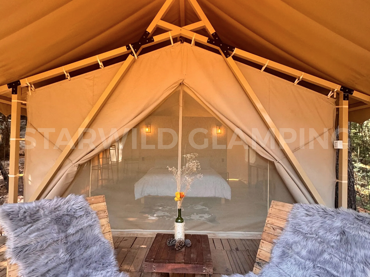 在气候防护方面,六芒星帐篷可选配防寒保温棉,有效阻隔冷热空气交换,延长季节性运营周期,提升室内舒适度。外层篷布采用高性能膜材,具备优异的防水、抗紫外线及自洁性能,确保长期户外使用的可靠性。 六芒星帐篷尤其适用于追求设计感与功能兼备的精品民宿、主题餐厅、艺术营地及活动庆典场景,以其独特的建筑语言,为项目注入神秘而迷人的气质。