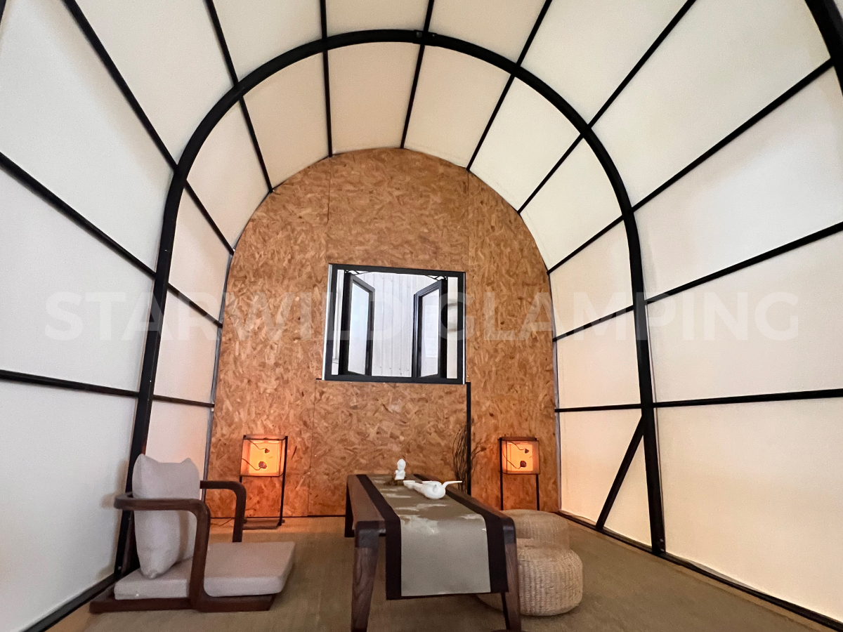 在空间实用性上,马车帐展现出令人惊喜的包容力。其内部采用4米加高设计,彻底打破传统帐篷的压抑感,营造出开阔轩朗的空间体验。超大的内部使用率可轻松容纳多人聚集,无论是作为特色住宿单元、主题餐厅包间,还是休闲茶吧、聚会空间,都能游刃有余。