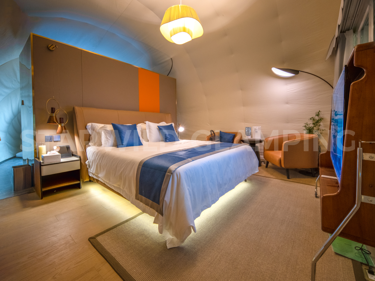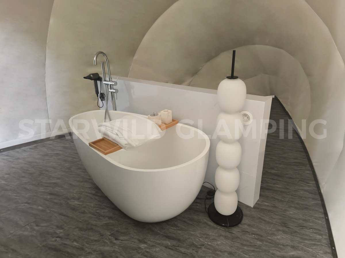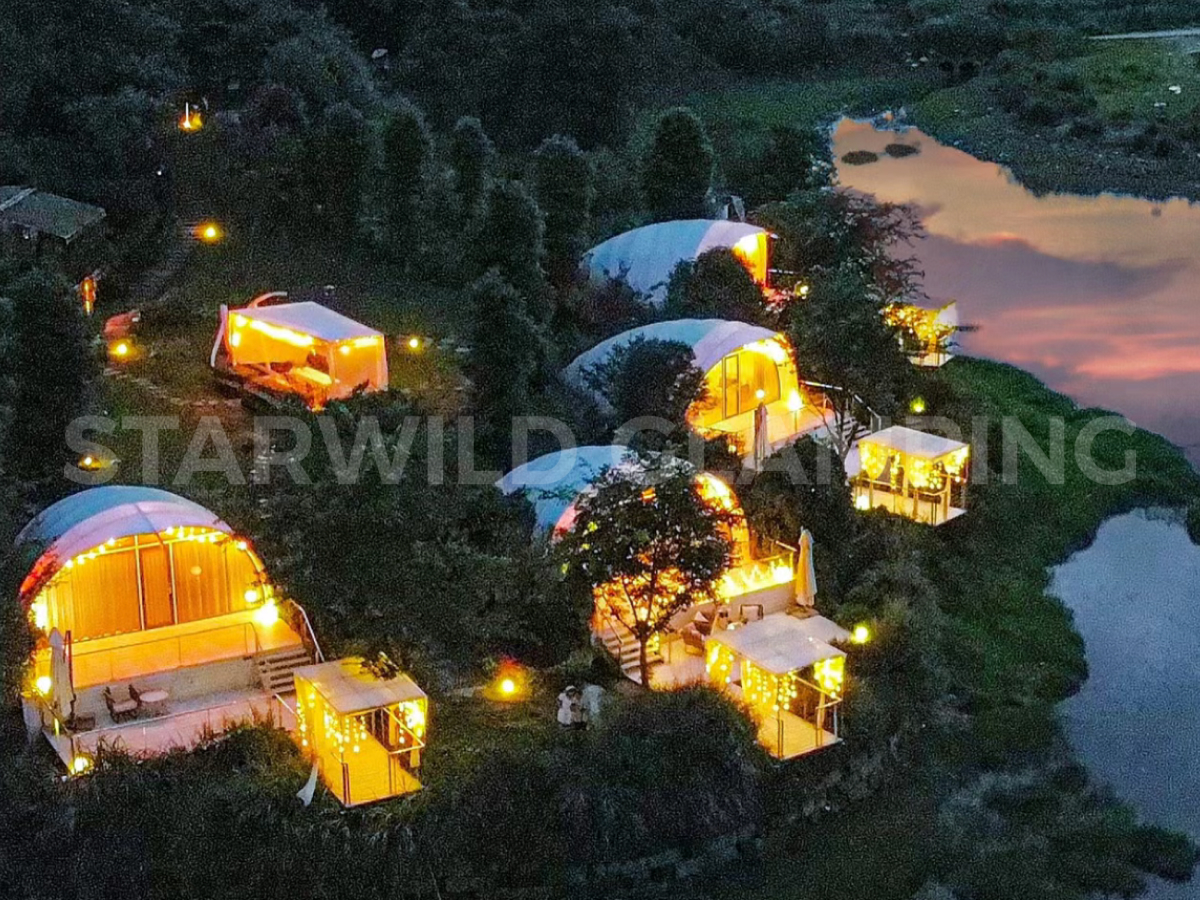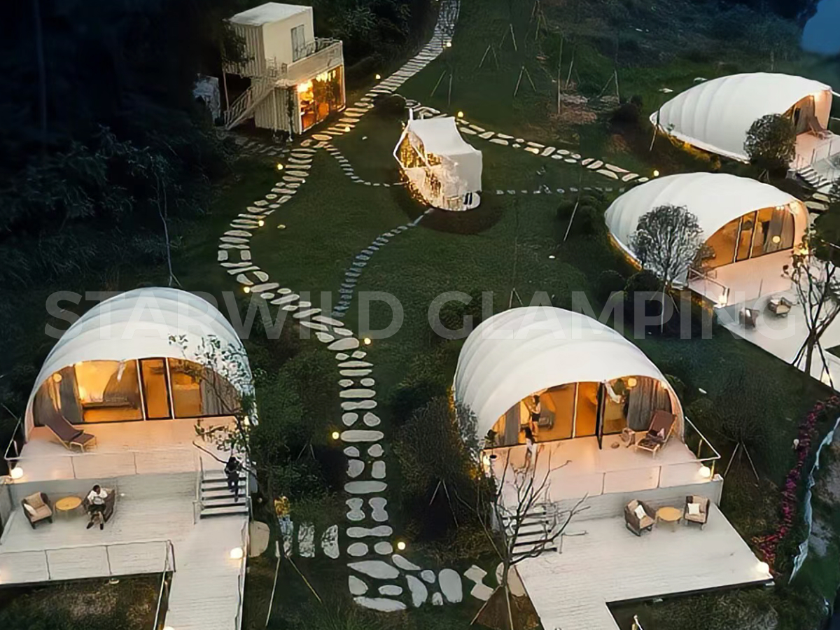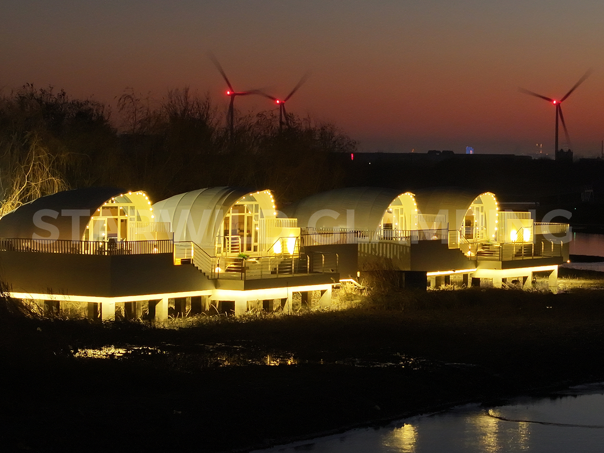 贝壳帐篷尤其注重场景融合——若项目临水而建,其灵动造型倒映湖光波影,可显著增强滨水空间的诗意与氛围感;若依山而设,则能以有机形态呼应山势,成为点缀自然、激活项目整体活力的艺术化建筑符号,适用于高端野奢住宿、景观餐厅、自然展厅等多种业态。