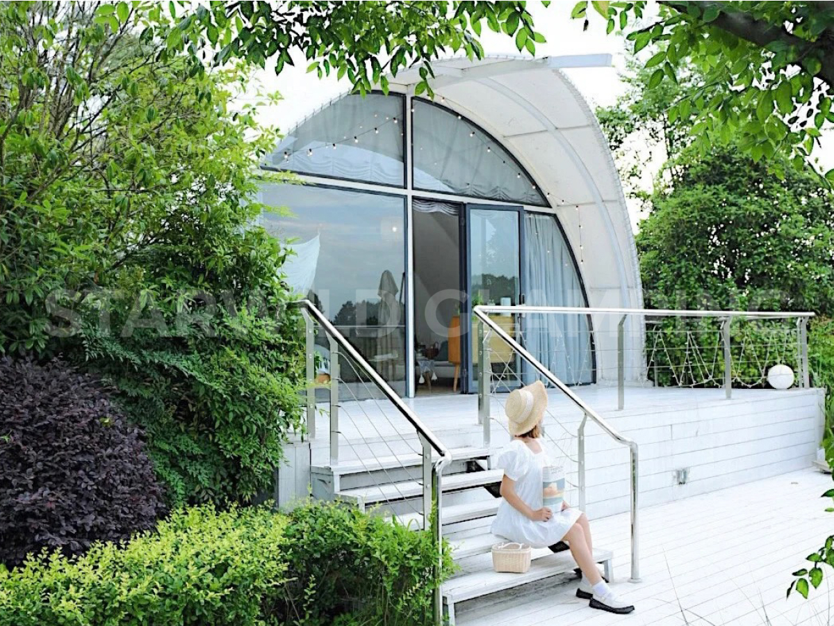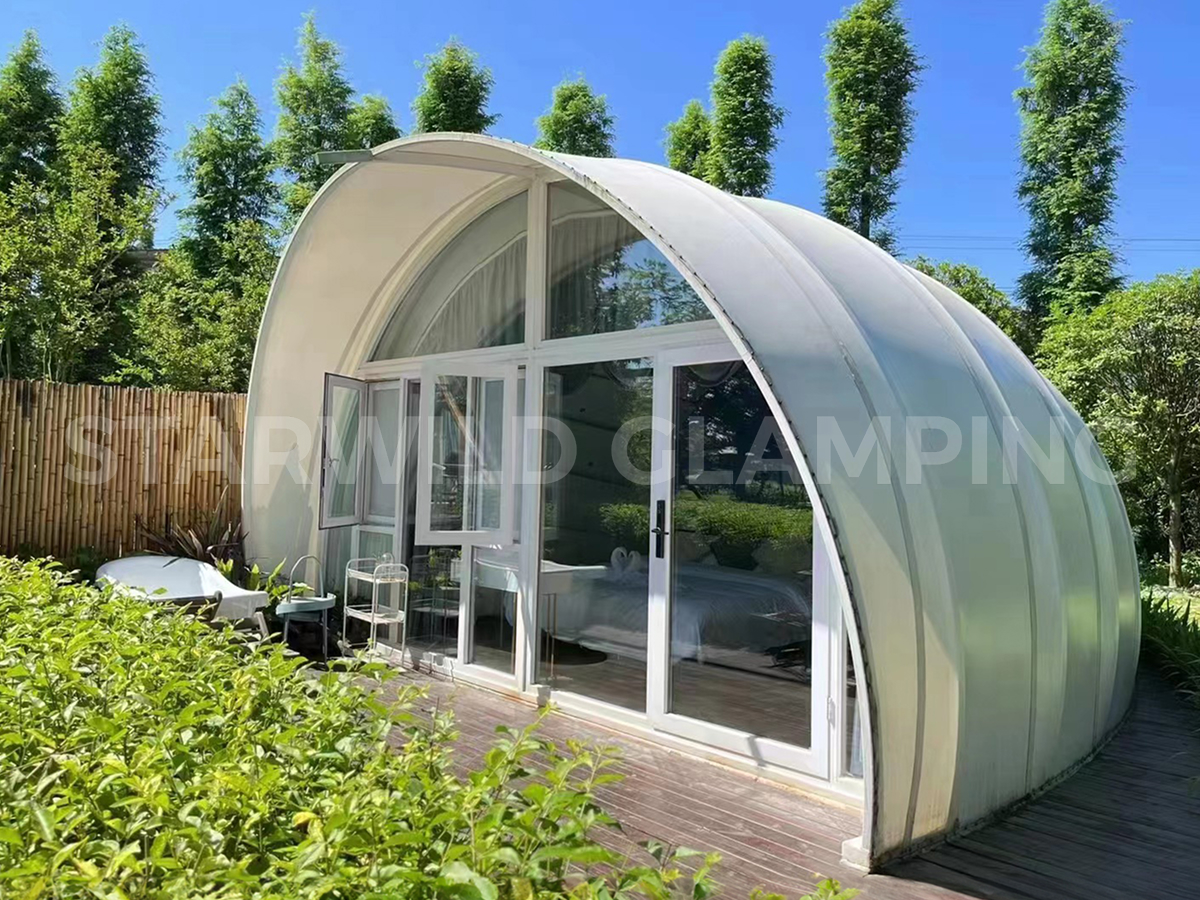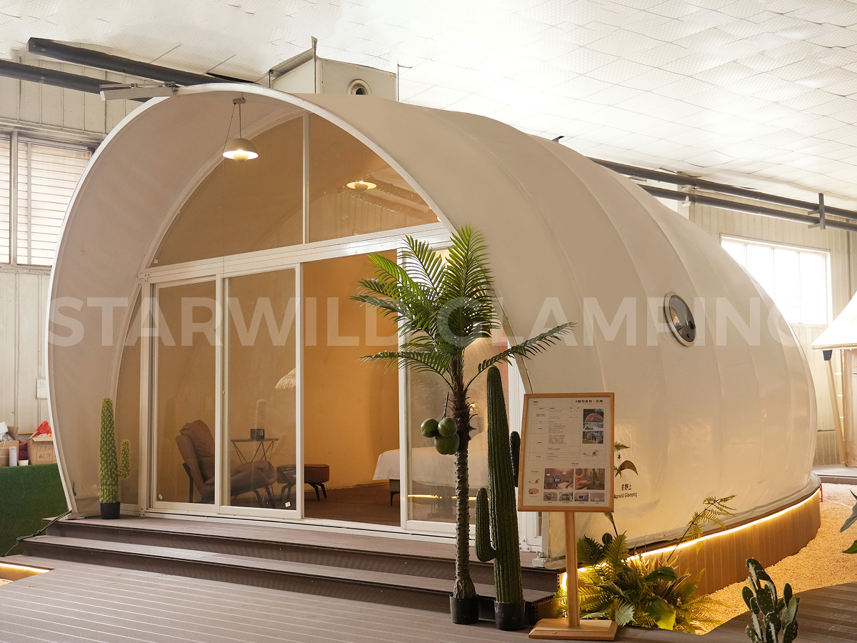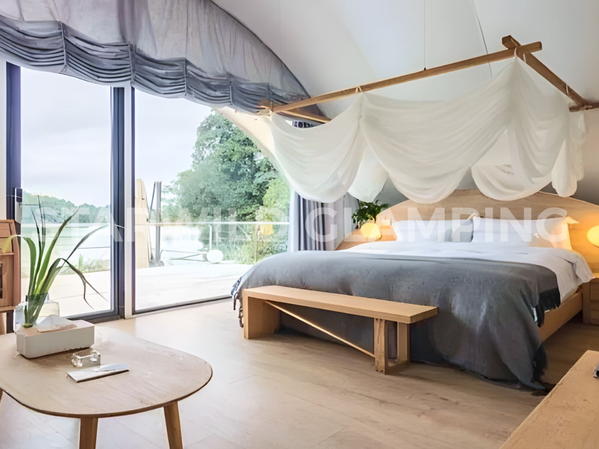贝壳帐篷以独特的仿生造型设计,将自然美学与建筑功能融为一体。其标志性的流畅曲面结构,搭配全景落地断桥铝中空玻璃幕,犹如自然生长于环境之中,可无界捕捉户外晨昏、山水四季之美。
