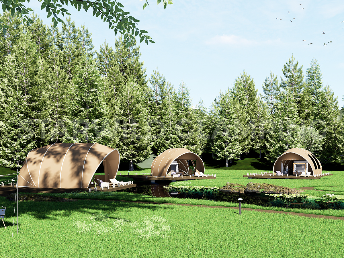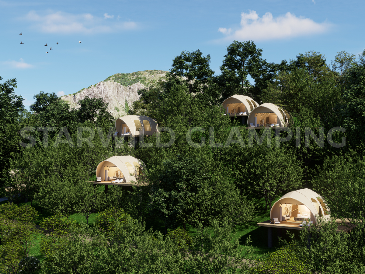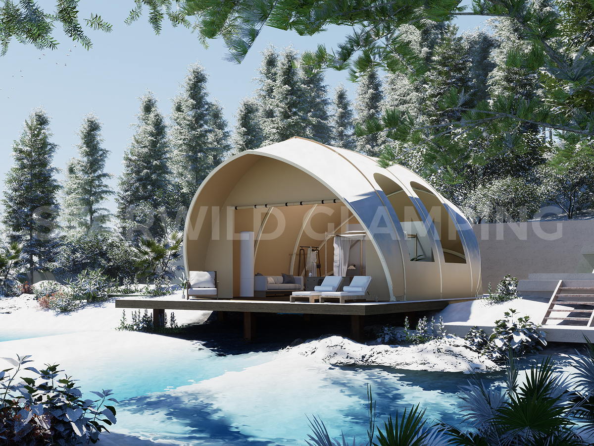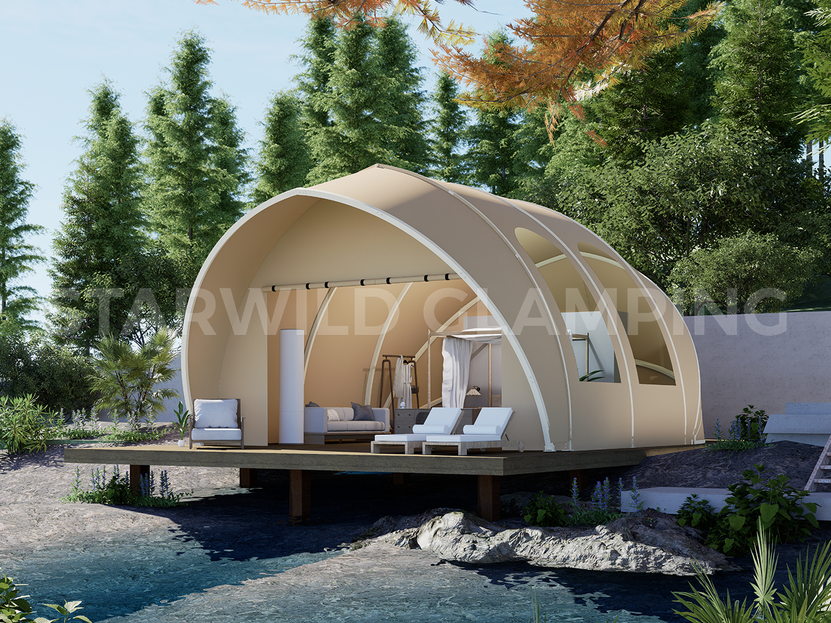 星链帐篷尤其注重场景融合——若项目临水,其灵动曲线与大舷窗倒映湖光,可塑造诗意滨水场景;若依山而建,则能以有机形态呼应山势,成为激活自然氛围的艺术建筑符号。适用于高端野奢住宿、景观餐厅、自然展厅等多重业态,实现美学与功能的和谐统一。