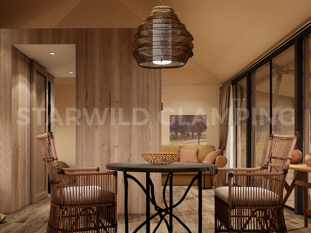 帐篷自带开放式露台,形成室内外自然过渡的休闲区域。前庭院可根据项目定位灵活搭配泳池、温泉泡池或景观绿植,成为提升项目地娱乐属性与视觉曝光的核心亮点。