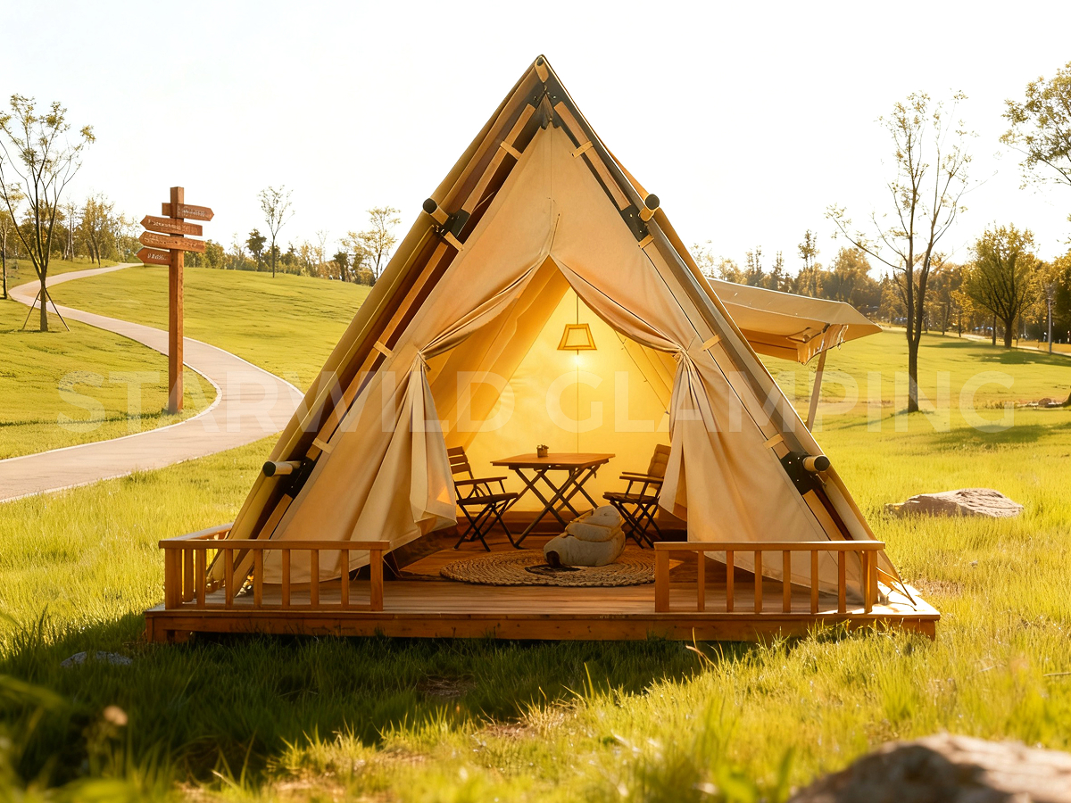 北极星帐篷以极简的三角形几何外观,在自然场景中轻盈点缀而不喧宾夺主,用最纯粹的建筑语言,传递出质朴而高级的美学气质。