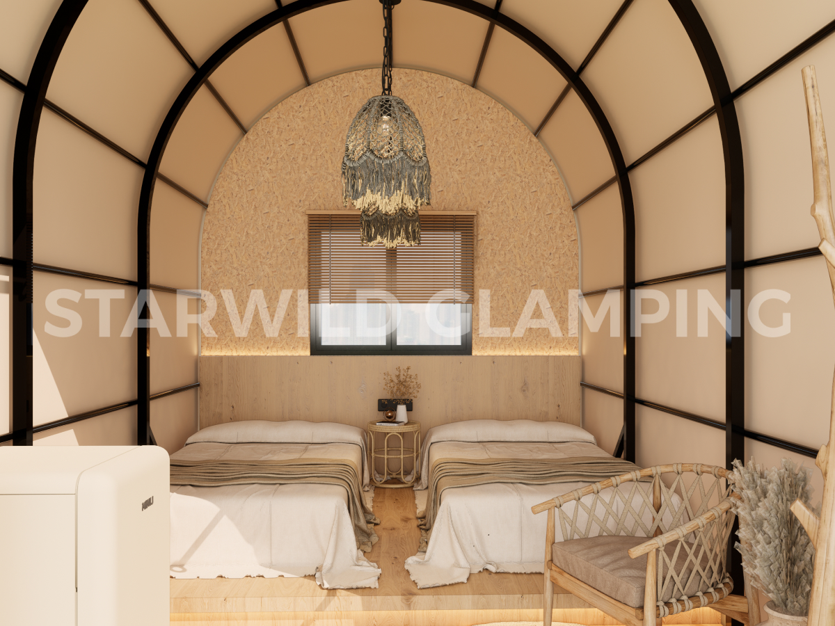 在空间实用性上,马车帐展现出令人惊喜的包容力。其内部采用4米加高设计,彻底打破传统帐篷的压抑感,营造出开阔轩朗的空间体验。超大的内部使用率可轻松容纳多人聚集,无论是作为特色住宿单元、主题餐厅包间,还是休闲茶吧、聚会空间,都能游刃有余。