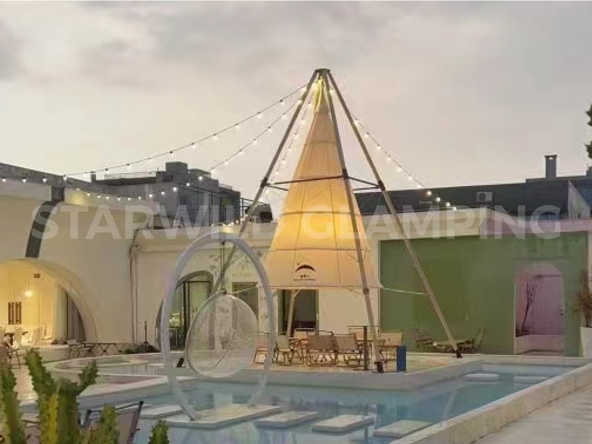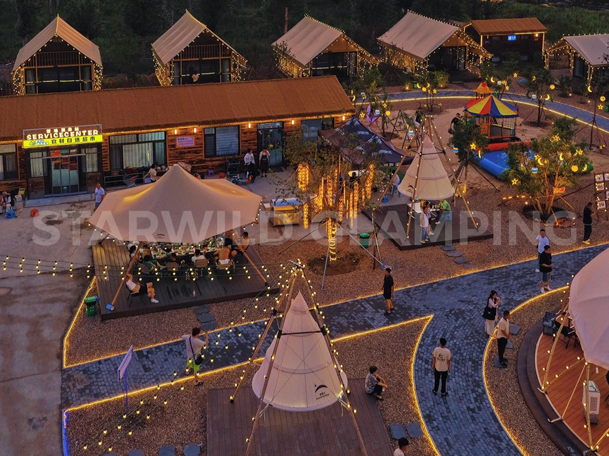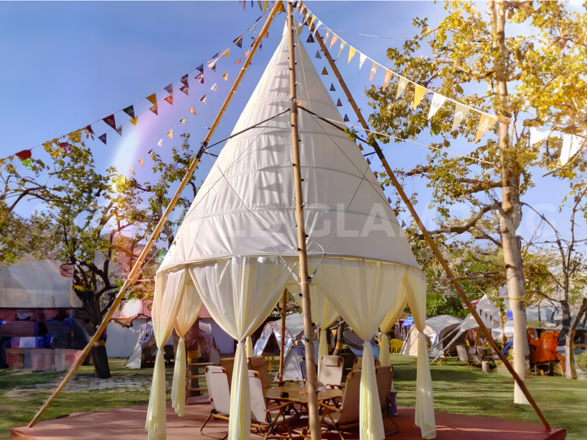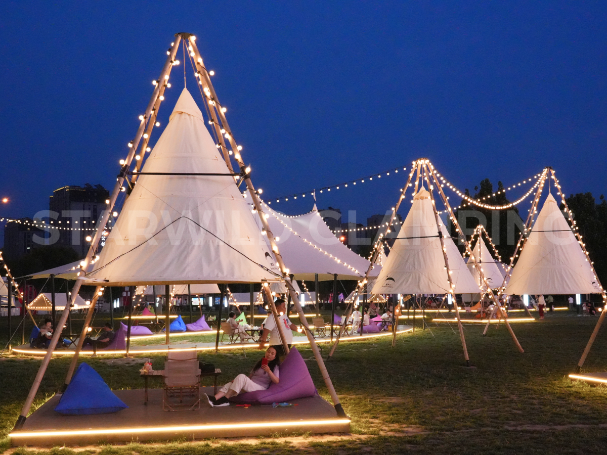 作为营地中的氛围担当,竹节灯笼帐篷适用于户外餐厅、户外酒吧、休闲茶歇、草坪活动、市集摊位、打卡装置等多种开放式场景。其独特的灯笼形态与温暖气质,使其成为点亮营地日间活力与夜间经济的核心元素,以一顶之力,为项目注入灵动与温度。